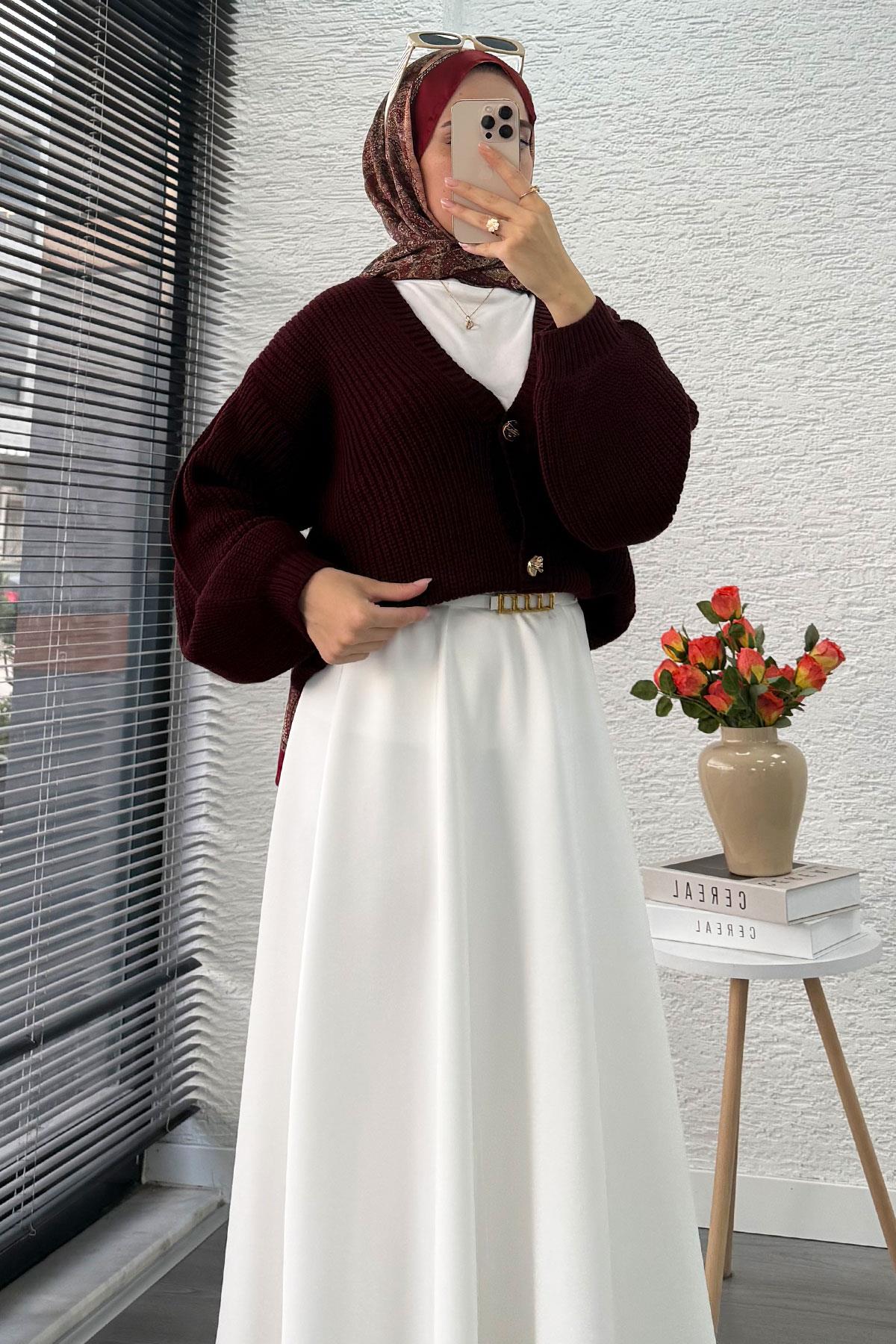 Gold düğme detayı, salaş balon kollar ve V yaka tasarım, klasik triko görünümünü modern bir yorumla buluşturur. Mevsim geçişlerinde kurtarıcı parça olan bu hırka; ister ofis şıklığında, ister kampüs stilinde, ister günlük kombinlerde rahatlıkla tercih edilebilir. Pinterest tarzı ilhamlık kombinlerin olmazsa olmaz parçasıdır.