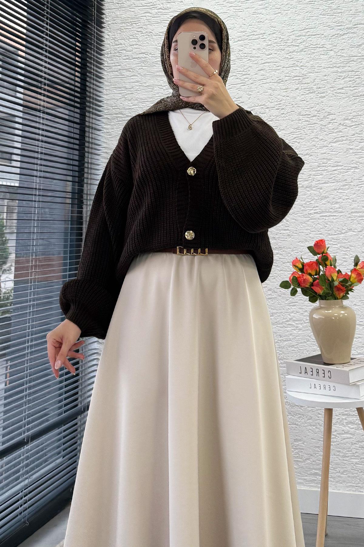 Balon Kol Gold Düğmeli Triko Hırka – Kahverengi (mlk15493)