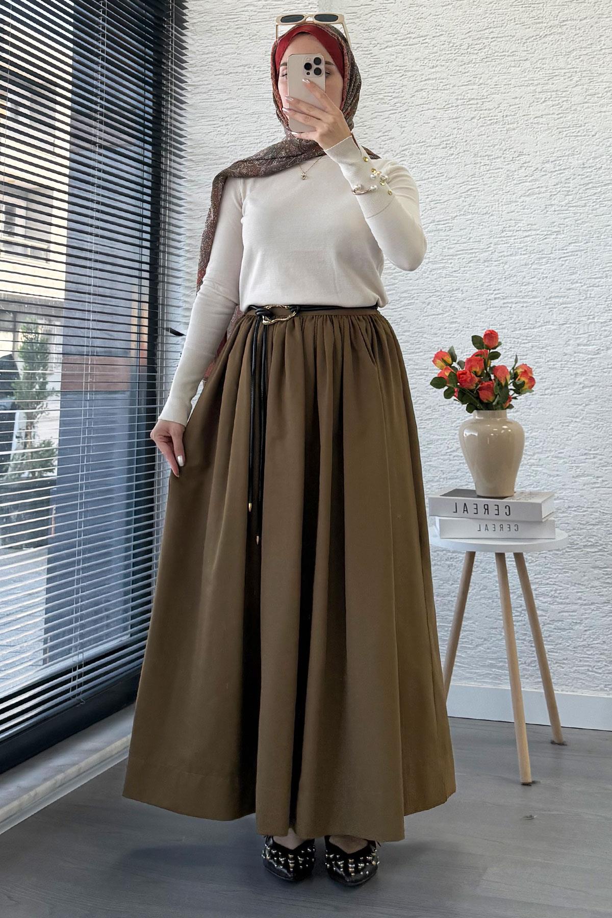 Olive tonundaki eteği beyaz basic gömlek ve kahve tonlarında kemerle kombinleyebilirsin.