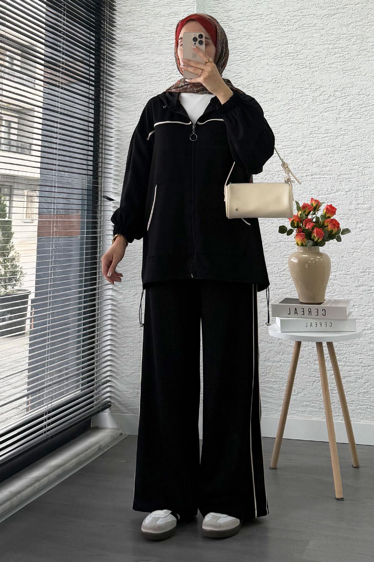 Cepli tasarım • Detaylar: Fermuarlı, kapüşonlu üst – biye detaylı kesim – cepli üst ve alt • Manken: 165 cm / 52 kg (S beden çekim)