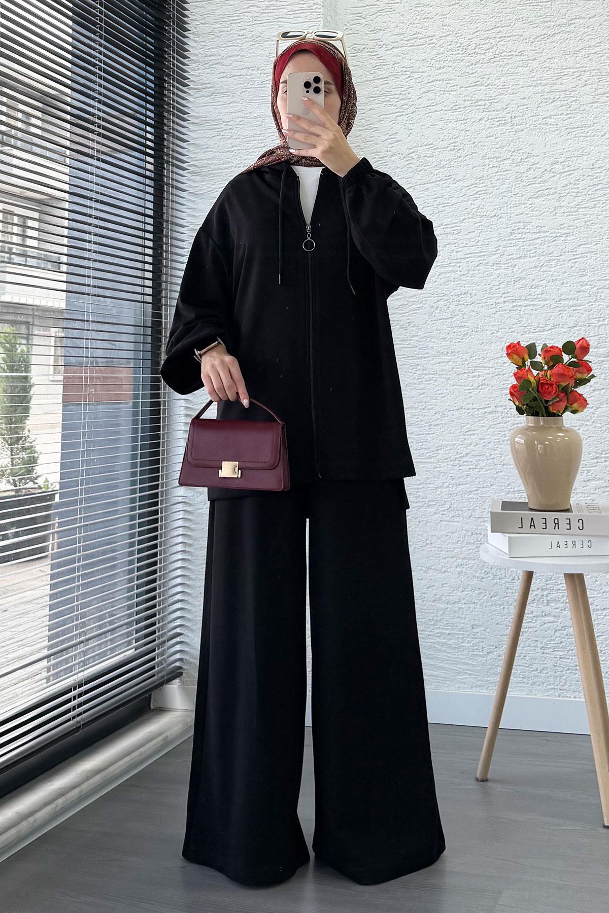 Bol paça fermuarlı ikili takım, modern kesimi ve yüksek konforlu iki iplik kumaşıyla spor şıklığın en güçlü temsilcilerinden biridir. Oversize kalıbı vücuda yapışmadan rahat bir siluet sunarken, kapüşonlu fermuarlı üst ve cepli pantolon fonksiyonel kullanım sağlar.