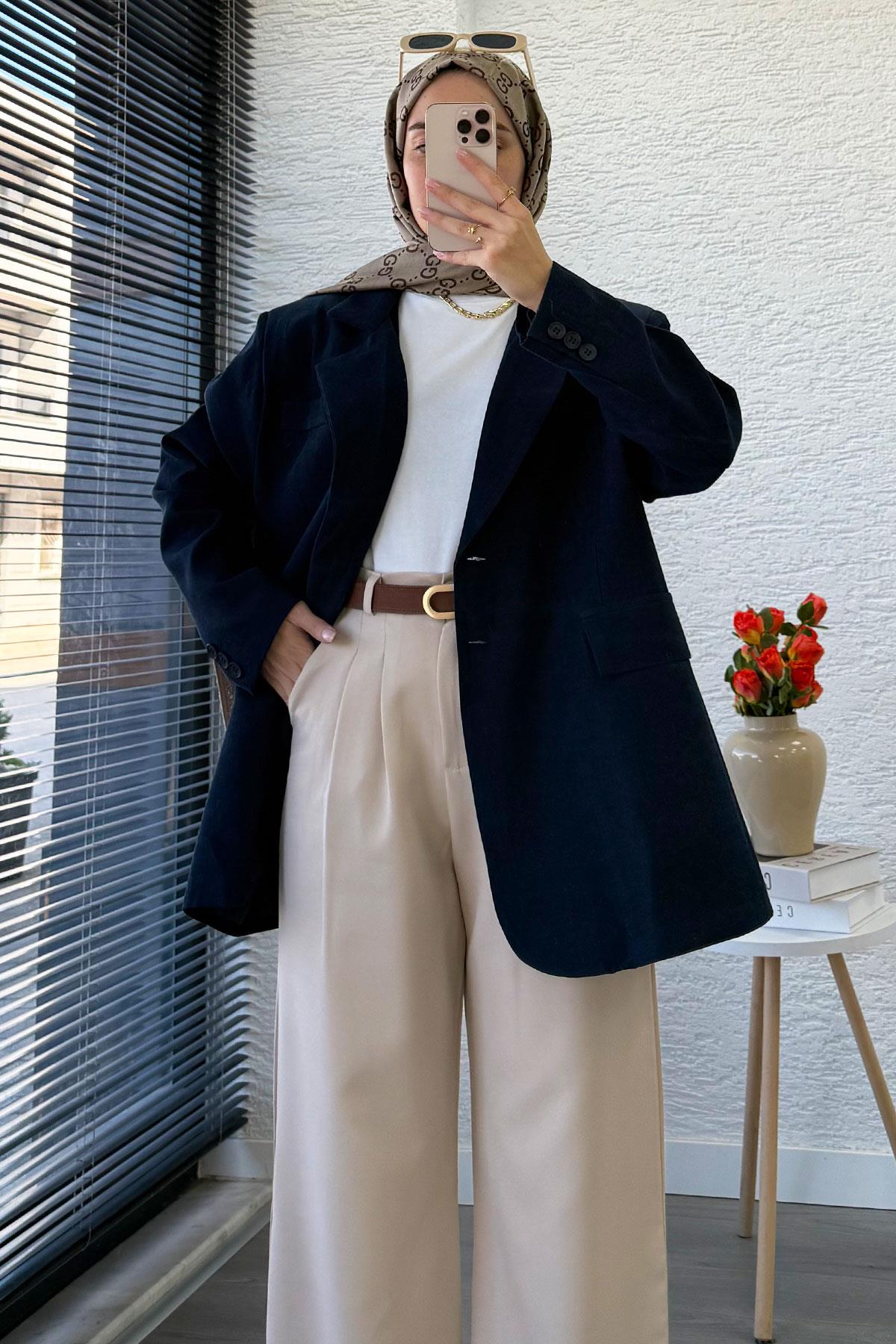 İki Düğmeli Keten Blazer Kadın Ceket - Lacivert (mlk15446)