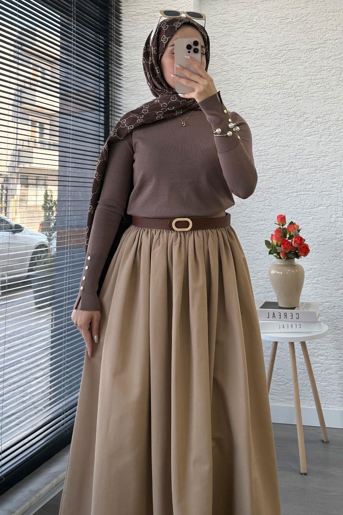 Kolları Düğme Detaylı Kısa Merserize Triko Kazak – Vizon (mlk15473)