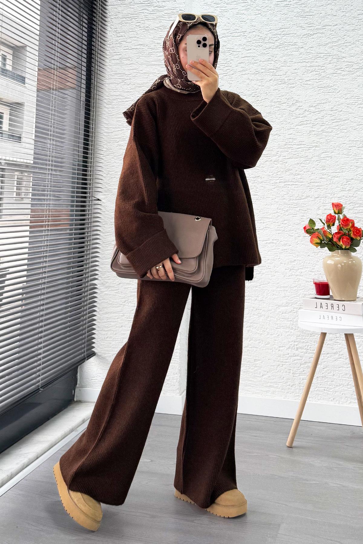 Kolu Katlı Yırtık Detaylı Tasarım Triko Takım – Kahverengi (mlk15569)