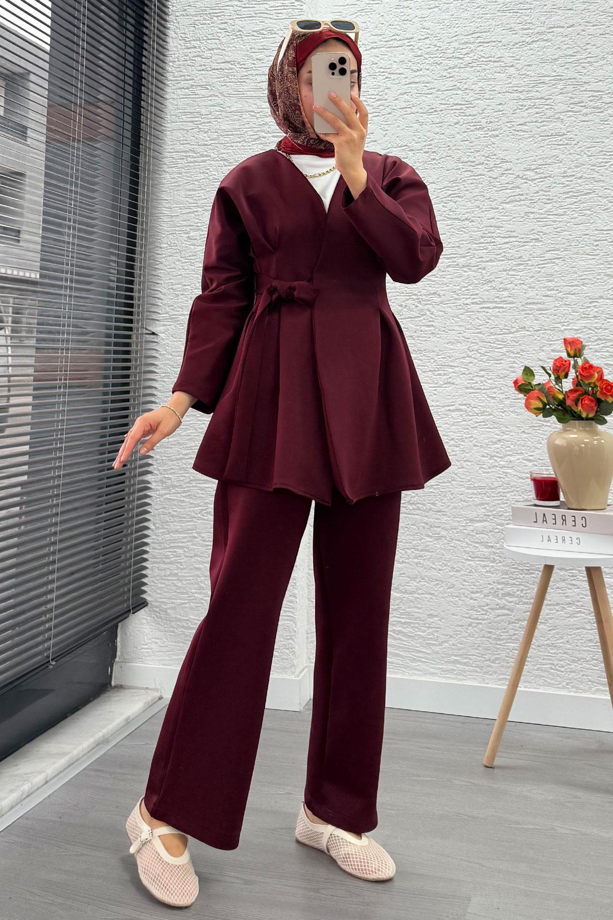 Kruvaze Yaka Pensli Tasarım Scuba Takım - Bordo