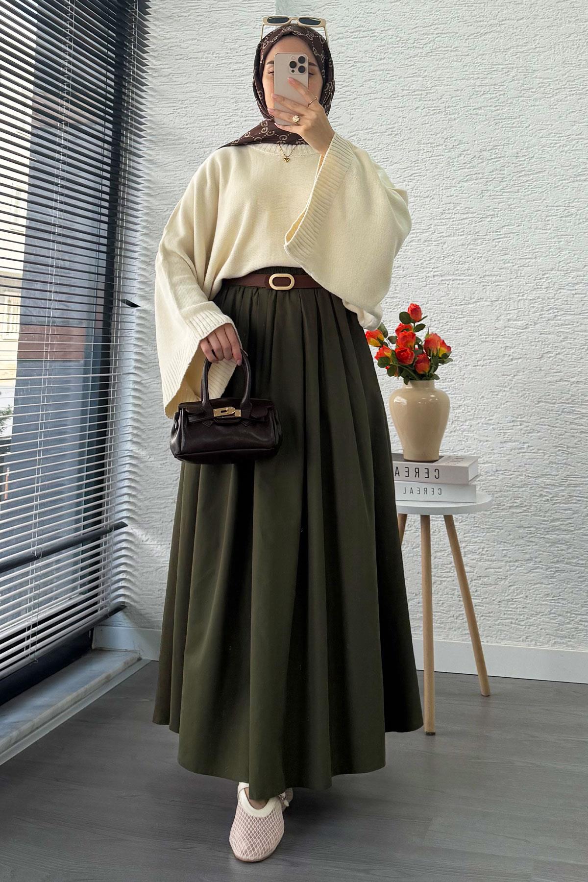 Nervür Detaylı Cepli Poplin Etek – Haki (mlk15501)