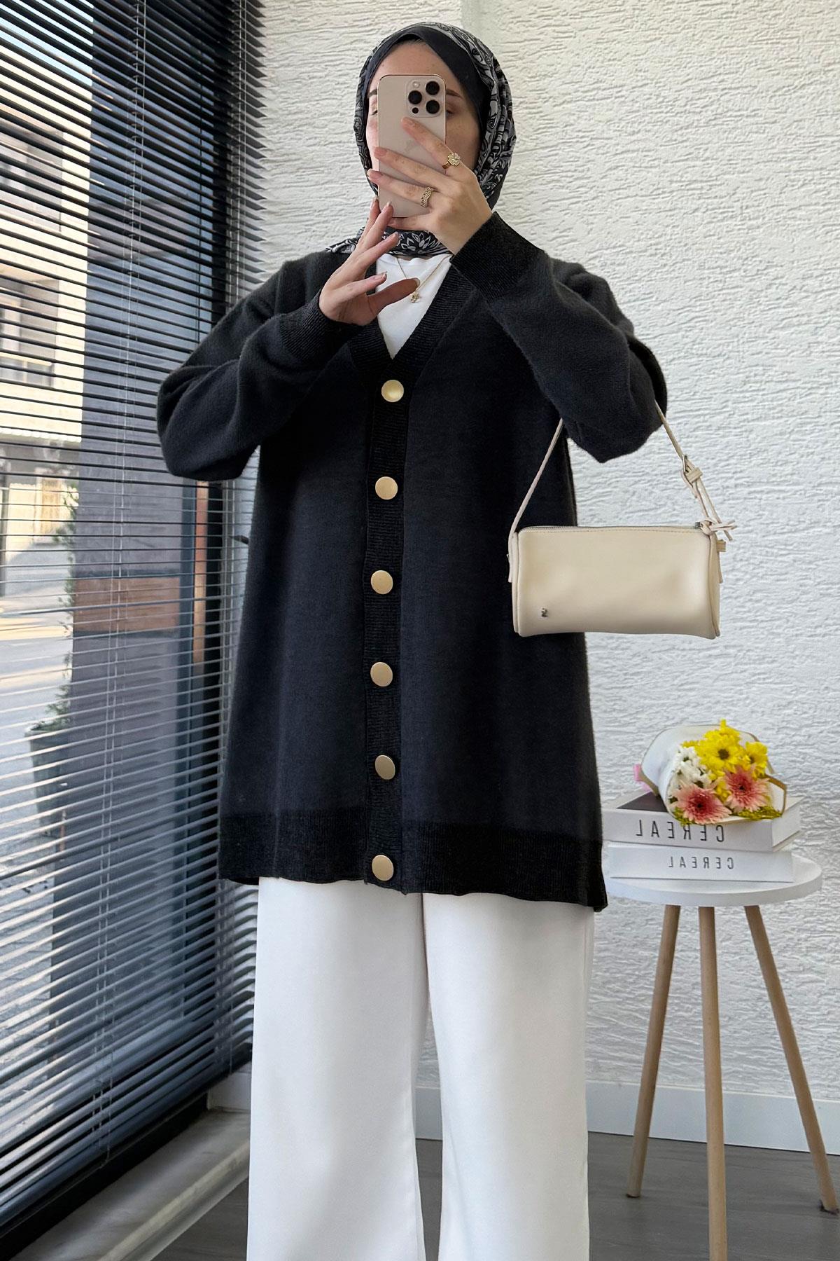 Zamansız şıklığı modern konforla buluşturan önü düğmeli yumoş kadın hırka, günlük kombinlerden ofis stiline kadar pek çok alanda kurtarıcı bir parça. 75 cm uzunluğu, 120 cm göğüs ölçüsü ve oversize kalıbı sayesinde standart bedene rahatlıkla uyum sağlıyor.