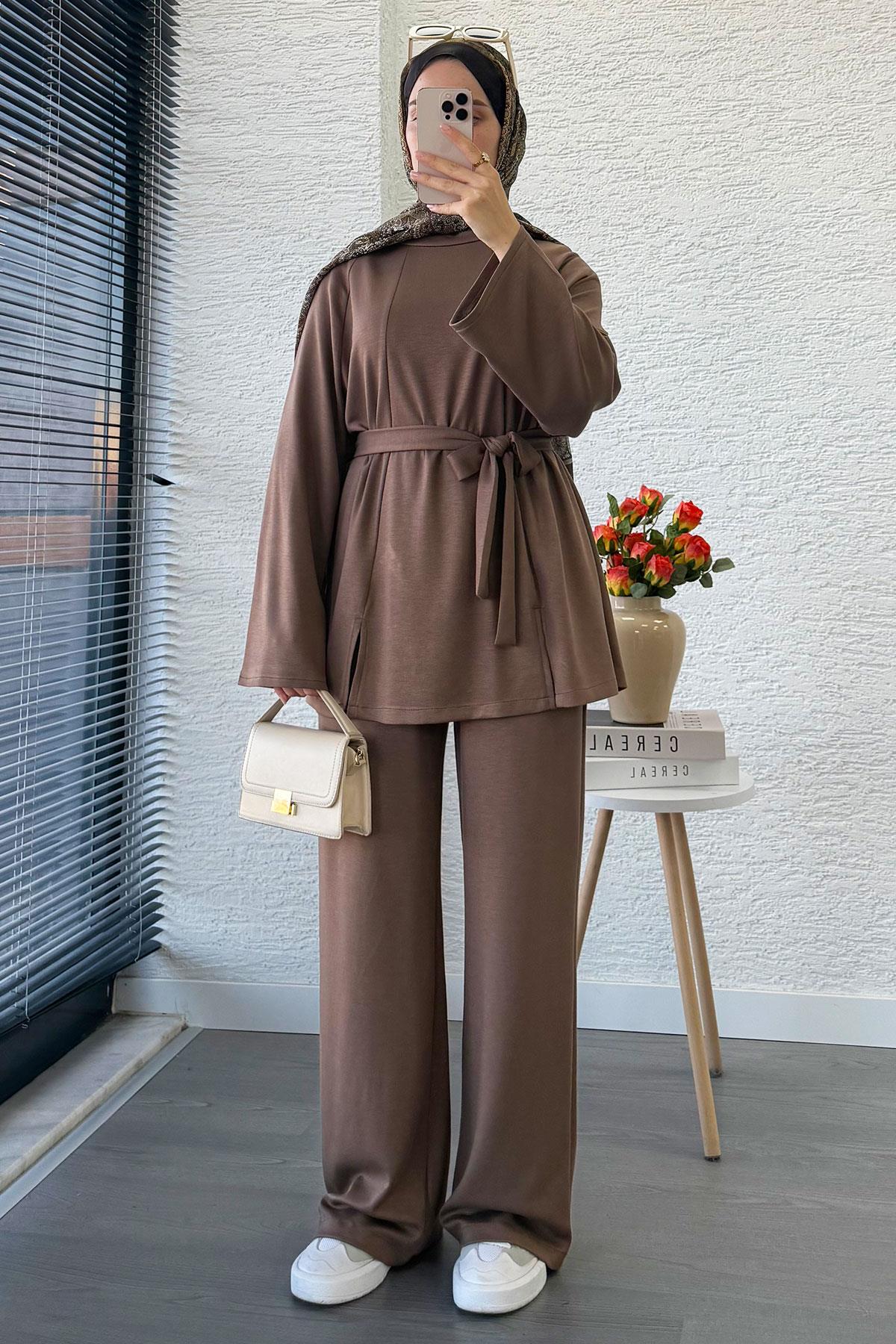 Önden Yırtmaç Detaylı İkili Takım - Kahverengi (mlk15413)