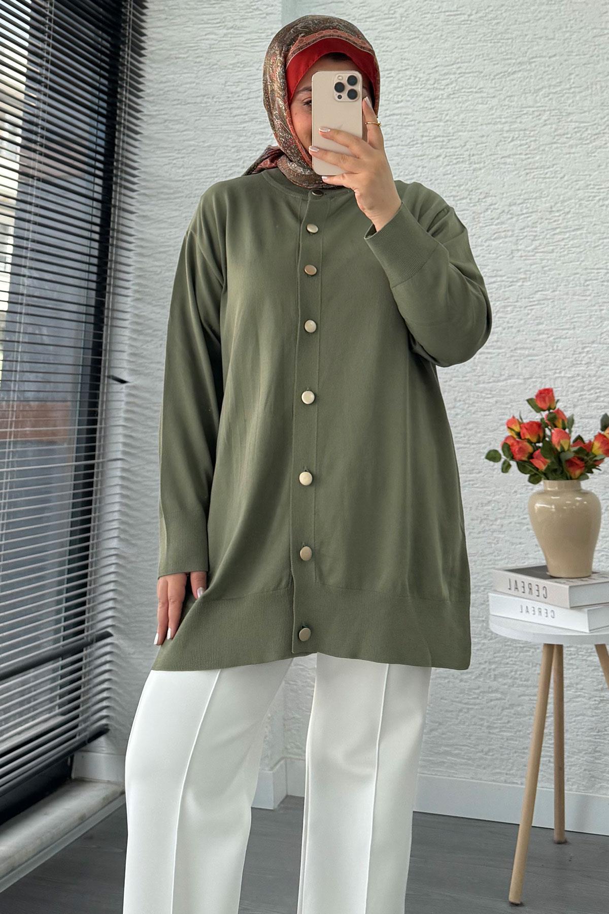 Önü Boydan Düğmeli Merserize Kadın Tunik – Haki (mlk15507)
