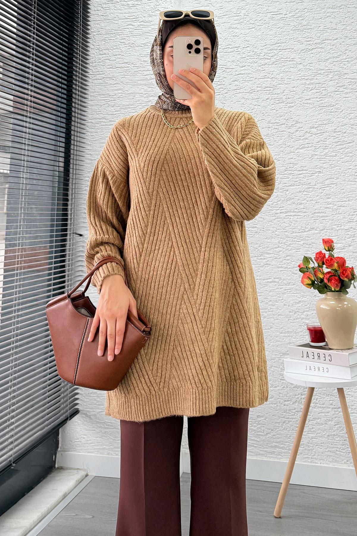 Önü Çizgi Desenli Oversize Triko Kazak – Camel (mlk15541)