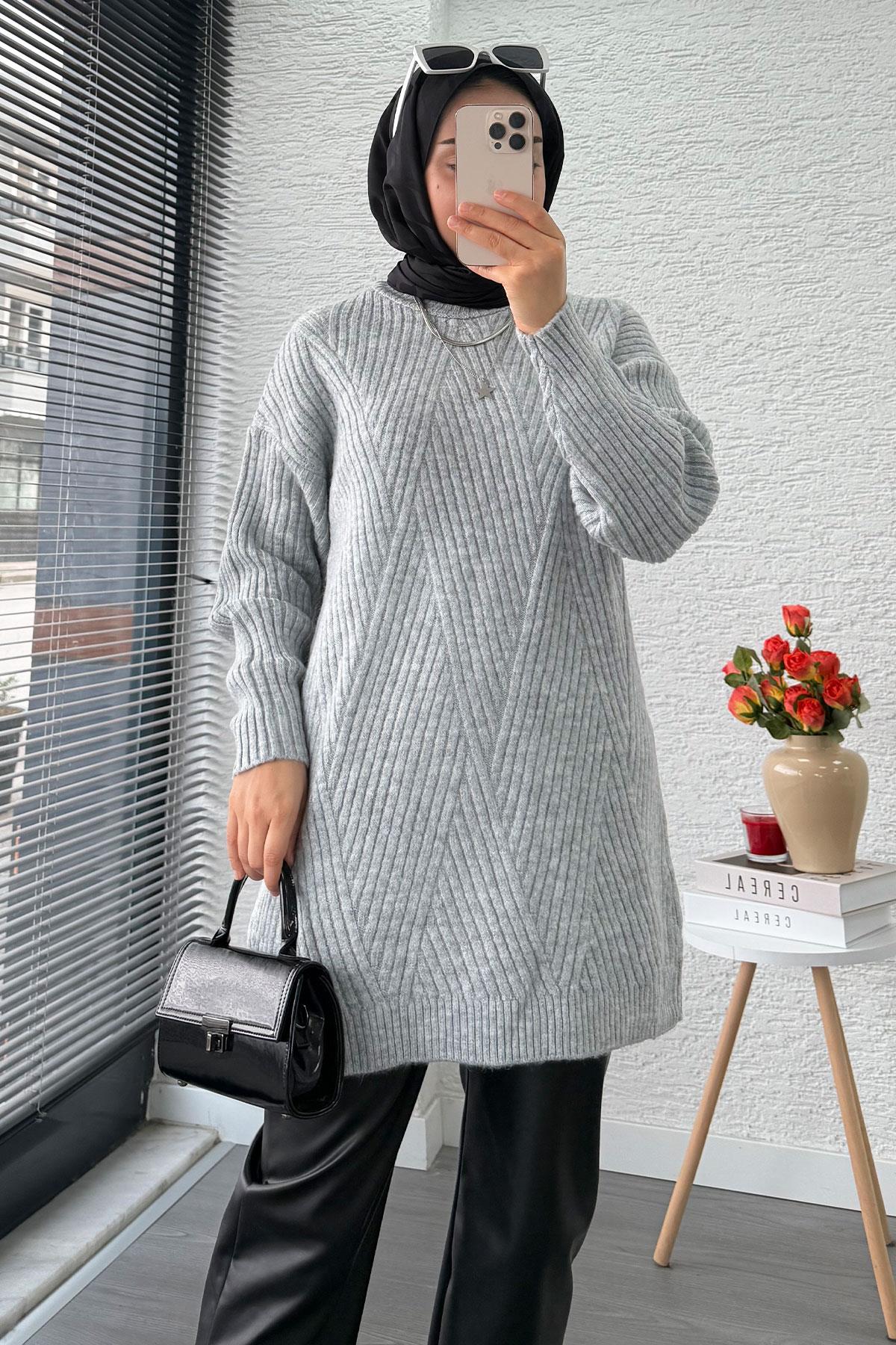 Önü Çizgi Desenli Oversize Triko Kazak – Gri (mlk15546)