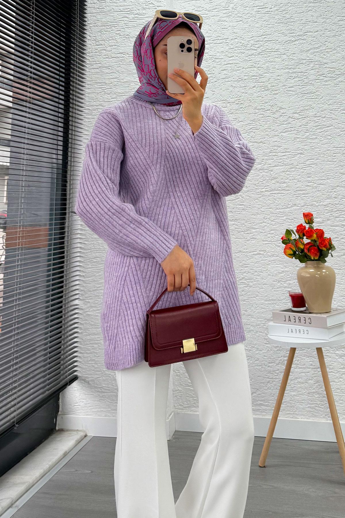 Önü Çizgi Desenli Oversize Triko Kazak – Lila (mlk15544)