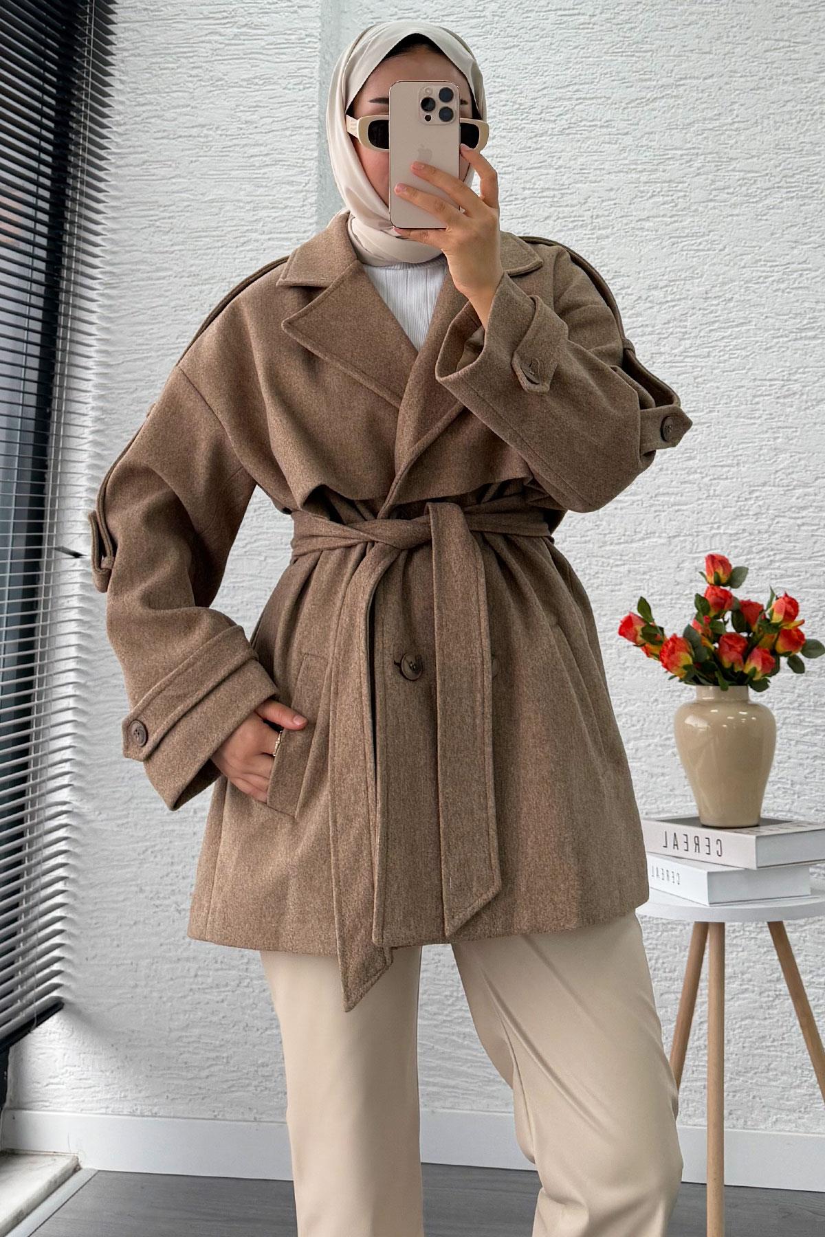 Premium Dört Düğmeli Kısa Kaşe Kaban – Camel (mlk15532)