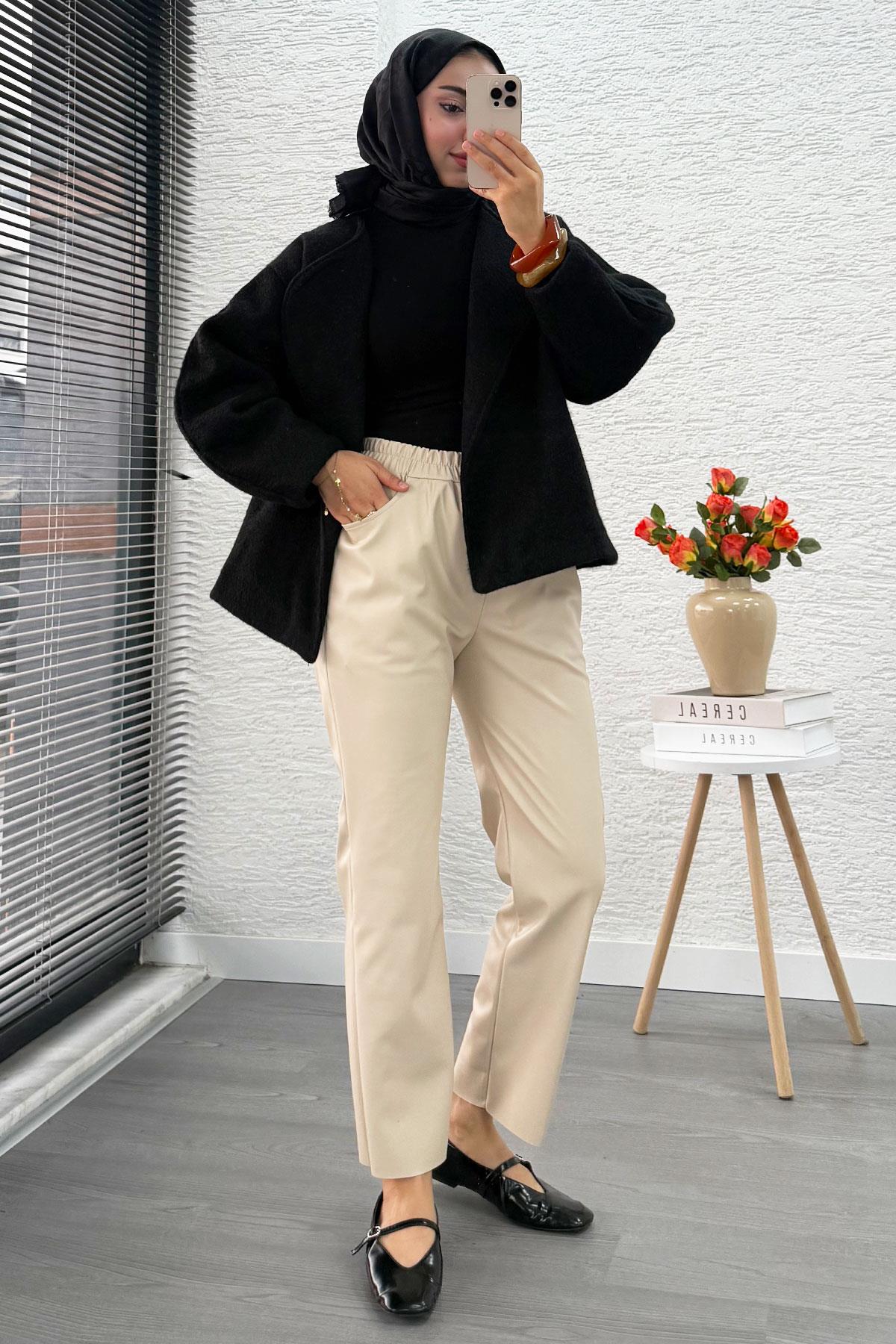 Premium Havuç Kesim Deri Pantolon – Krem (mlk15519)