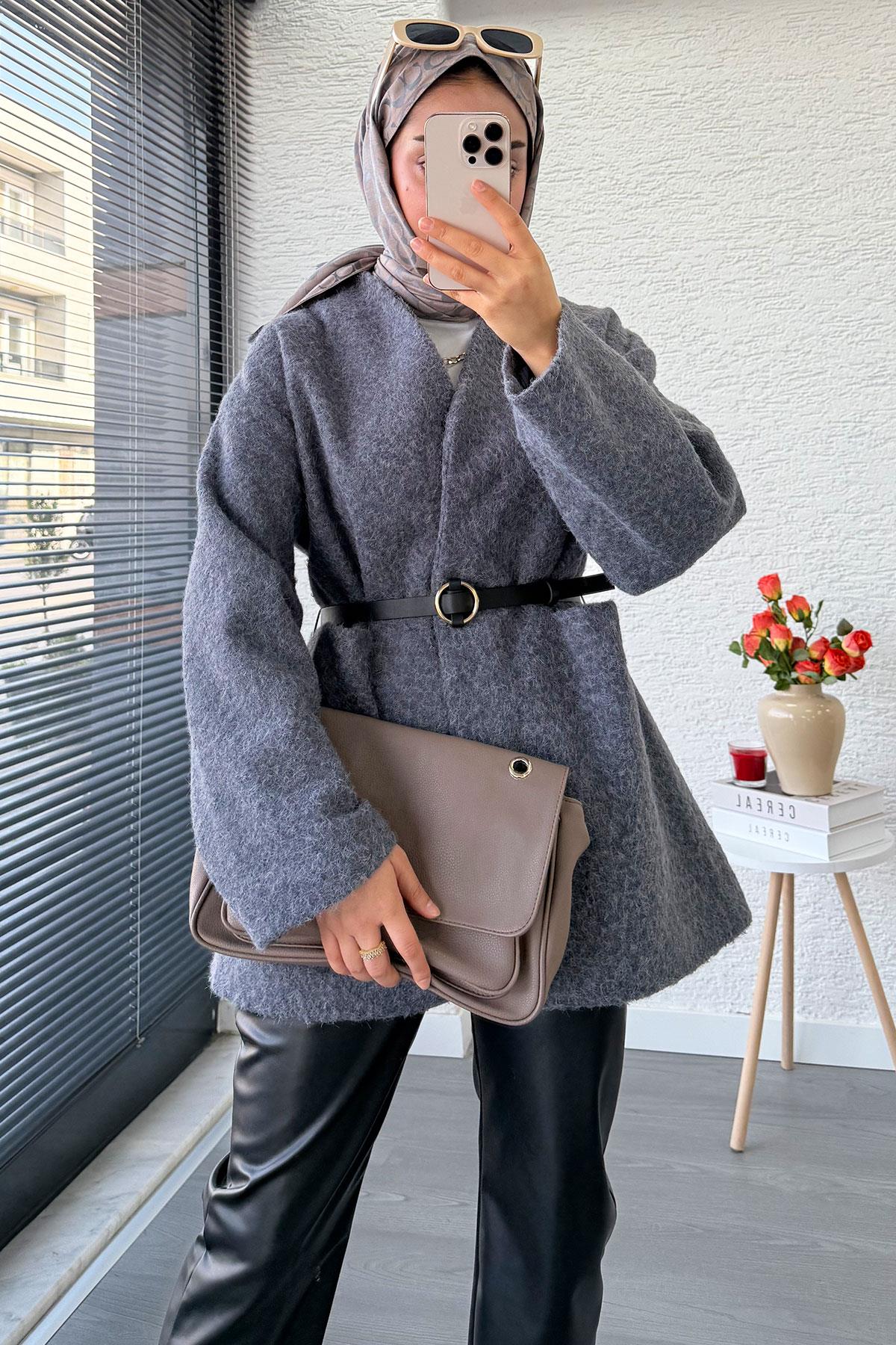 Premium Kemerli Kruvaze Yaka Keçe Kaban – Antrasit (mlk15611)