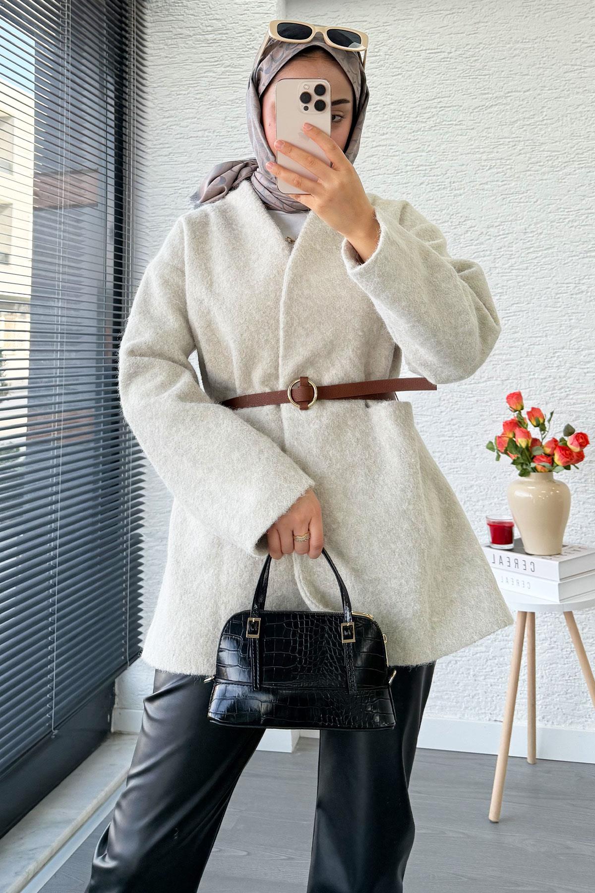 Premium Kemerli Kruvaze Yaka Keçe Kaban – Taş (mlk15608)