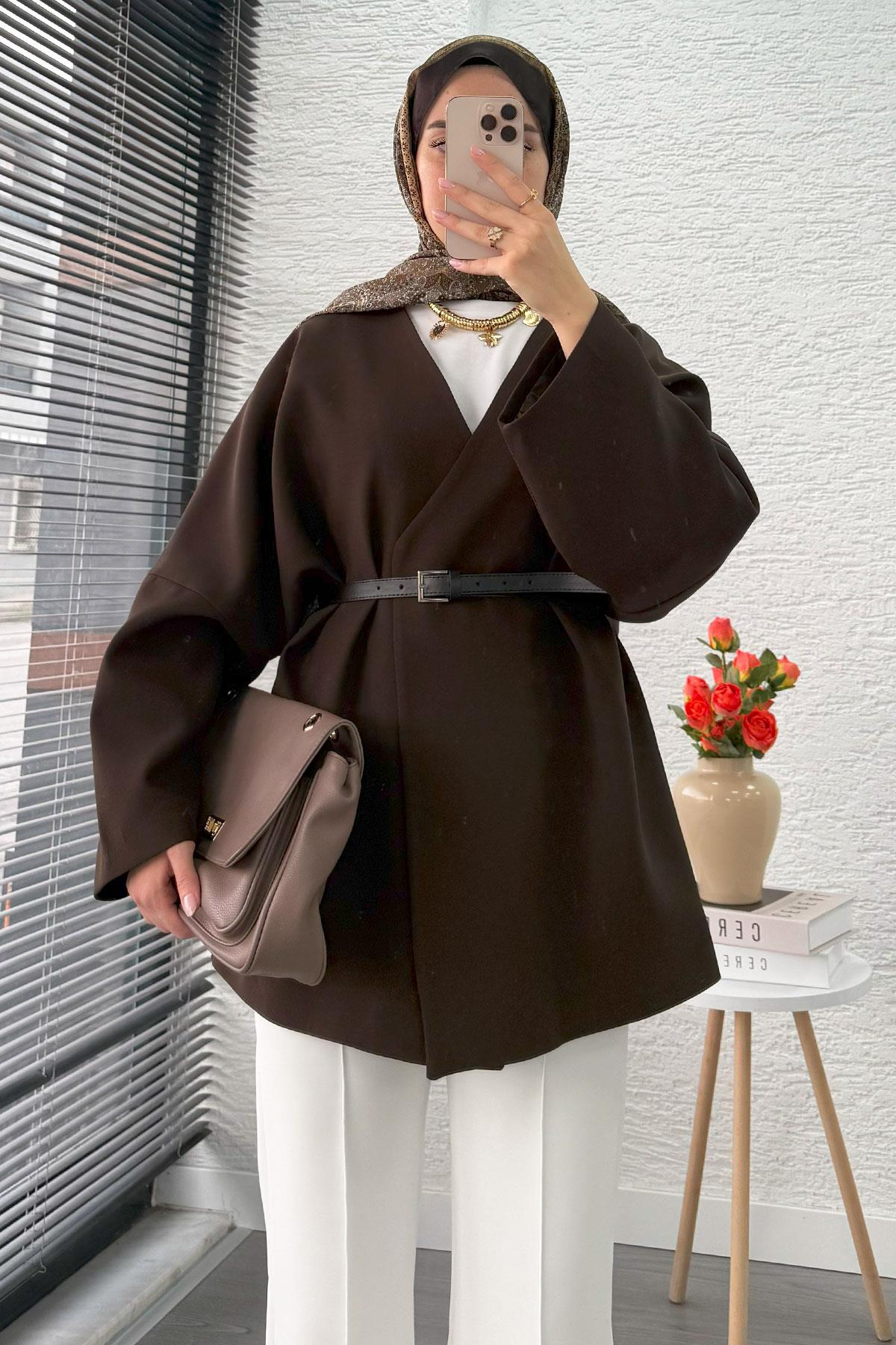 Premium Kruvaze Yaka Kemerli Kadın Ceket – Kahverengi (mlk15512)